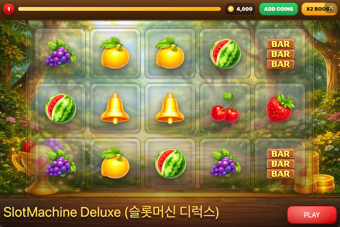SlotMachine Deluxe (슬롯머신 디럭스)은 자연 속 정원 테마와 화사한 과일 심볼이 어우러진